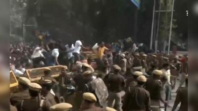 बैरिकेडिंग पर चढ़े प्रदर्शनकारी, बढ़ा तनाव