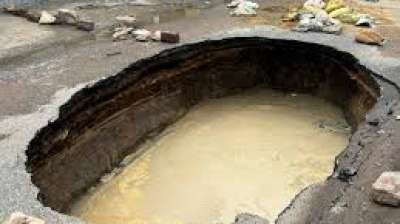 बारिश में हुआ सड़क पर 15 फीट का गड्ढा