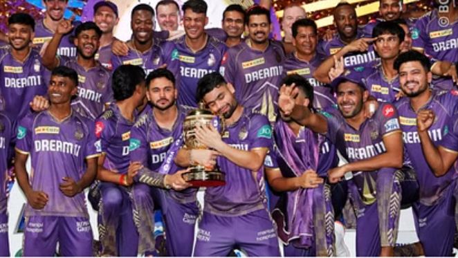 कोलकाता नाइट राइडर्स की जीत के साथ आईपीएल 2024 का अंत हो गया। श्रेयस अय्यर की अगुवाई में टीम ने रविवार को सनराइजर्स हैदराबाद के खिलाफ आठ विकेट से ऐतिहासिक जीत दर्ज की। मैच के बाद टीम के कप्तान ने दिग्गज फुटबॉलर लियोनल मेसी की तरह जीत का जश्न मनाया। इसका वीडियो अब सोशल मीडिया पर काफी तेजी से वायरल हो रहा है।खिताबी मुकाबले में टॉस जीतकर पहले बल्लेबाजी करने उतरी सनराइजर्स हैदराबाद 18.3 ओवर में 113 रन के स्कोर पर ऑलआउट हो गई। जवाब में कोलकाता की टीम ने 10.3 ओवर में दो विकेट गंवाकर 114 रन बनाए और आठ विकेट से मुकाबला जीत लिया। कोलकाता ने इससे पहले अपना अंतिम खिताब 2014 सीजन में पंजाब किंग्स को हराकर जीता था और अब 10 साल बाद टीम ने फिर ट्रॉफी पर कब्जा जमा लिया है।कोलकाता की जीत के बाद बीसीसीआई के अध्यक्ष रोजर बिन्नी और सचिव जय शाह ने कप्तान श्रेयस अय्यर को ट्रॉफी सौंपी। इसके बाद उन्होंने अपनी टीम के साथ जश्न मनाया। अय्यर ने दिग्गज फुटबॉलर लियोनल मेसी की तरह जीत का जश्न मनाया। दरअसल, मेसी ने दिसंबर 2022 में अर्जेंटिना के फीफा वर्ल्ड कप जीतने के बाद कतर में इस तरह ही जश्न मनाया था।
