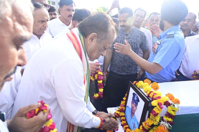 जयपुर, 10 जुलाई। शहीद पायलट फ्लाइट लेफ्टिनेंट ऋषिराज को अंतिम विदाई देने गोपालन, डेयरी, पशुपालन एवं देवस्थान मंत्री श्री जोराराम कुमावत उनके पैतृक गांव पाली जिले के सुमेरपुर स्थित खिंवादी गांव पहुंचे। उन्होंने शहीद के पार्थिव शरीर पर पुष्प चक्र चढ़ाकर उन्हें विनम्र श्रद्धांजलि दी।