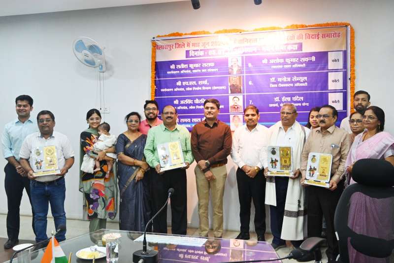 बिलासपुर । शासन के विभिन्न विभागों में पदस्थ वरिष्ठ अधिकारियों की सेवानिवृत्ति पर आज जिला कार्यालय में आयोजित कार्यक्रम में उन्हें सामूहिक रूप से भावभीनी बिदाई दी गई। कार्यक्रम में अधिकारियों के परिवारजन भी शामिल हुए। इन अधिकारियों में जल संसाधन विभाग के कार्यपालन अभियंता सतीश सराफ, पीडब्ल्यूडी ई.एन.एम के कार्यपालन अभियंता एच.एल.शर्मा, पीडब्ल्यूडी संभाग क्रमांक 02 के कार्यपालन अभियंता अरविंद चौरसिया, आरईएस के कार्यपालन अभियंता समय लाल कैवर्त, जिला टीकाकरण अधिकारी मनोज सैमुअल, सहायक खाद्य अधिकारी अशोक सवन्नी एवं श्रेत्रीय प्रशिक्षण केन्द्र की प्राचार्य डॉ. ईला चंदेल शामिल है। जिला प्रशासन की ओर से कलेक्टर अवनीश शरण ने सभी अधिकारियों को शॉल, श्रीफल एवं स्मृति चिन्ह देकर सम्मानित किया। कलेक्टर ने सभी के सेवाकाल का स्मरण करते हुए उनके स्वस्थ, सुखद एवं दीर्घायु जीवन के लिए शुभकामनाएं दी। सभी अधिकारियों ने अपने लंबी सेवाकाल के रोचक अनुभव साझा किए। इस अवसर पर जिला पंचायत सीईओ आरपी चौहान एवं सहायक कलेक्टर तन्मय खन्ना ने भी सभी के कार्य की सराहना करते हुए उन्हें सुखद भविष्य की शुभकामनाएं दी।