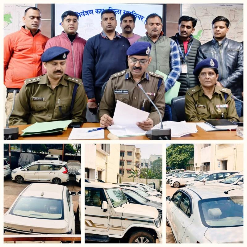 ग्वालियर | वरिष्ठ पुलिस अधीक्षक ग्वालियर श्री धर्मवीर सिंह (भा.पु.से.) के निर्देश पर क्राइम ब्रांच ग्वालियर ने संगठित वाहन ठगी के एक बड़े मामले का खुलासा करते हुए किराये पर गाड़ियां लेकर फर्जी दस्तावेजों के आधार पर उन्हें गिरवी रखने वाले शातिर आरोपी को गिरफ्तार किया है। पुलिस ने आरोपी की निशानदेही पर कुल 15 चार पहिया वाहन जब्त किए हैं, जिनकी अनुमानित कीमत करीब 1 करोड़ 50 लाख रुपये बताई जा रही है।