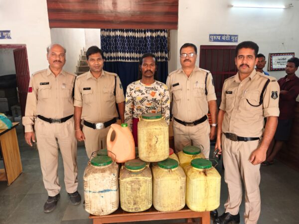 बिलासपुर । पुलिस अधीक्षक रजनेश सिंह के द्वारा जिले में नशे के व्यापारियों पर अंकुश लगाने चलाये जा रहे प्रहार अभियान के तहत लगातार कार्यवाही करने हेतु निर्देशित किया गया है। अतिरिक्त पुलिस अधीक्षक (ग्रामीण) श्रीमती अर्चना झा एवं अनुविभागीय अधिकारी (पुलिस) कोटा श्रीमति नुपूर उपाध्याय के मार्गदर्शन में थाना प्रभारी प्रशिक्षु. आईपीएस अजय कुमार के द्वारा टीम गठित कर थाना रतनपुर क्षेत्र के ग्राम कुऑजति में अरपा नदी किनारे जंगल में भारी मात्रा में कच्ची महुआ शराब बनाने की सूचना मिलने पर ग्राम कुऑजति के आसपास गाँव में मुखबिर तैनात किया गया था। उक्त मुखबिर सूचना पर ग्राम कुऑजति नंदी किनारे जंगल में कई बार प्रयास करने के पश्चात् आज अरपा नदी के किनारे बने टापू के जंगल में रेड कार्यवाही करने पर सफलता हाथ लगी। ग्राम बिल्लीबंद पोंड़ी थाना कोटा निवासी उमेंदा बाई धनवार के कब्जे से 105 लीटर कच्ची महुआ शराब व बंधन सिंह धनवार के कब्जे से 140 लीटर कच्ची महुआ शराब कुल 240 लीटर कच्ची महुआ शराब कीमती 58000 रूपये को आरोपियों से को जप्त कर आरोपियों के विरूद्ध आबकारी एक्ट के तहत कार्यवाही कर उक्त आरोपियों को न्यायिक रिमाण्ड पर भेजा गया। आरोपी थाना कोटा क्षेत्र के हैं जो थाना रतनपुर क्षेत्र में अरपा नंदी किनारे टापू जंगल में भारी मात्रा में शराब बनाकर शराब को रतनपुर व कोटा थाना क्षेत्र के गॉवों में सप्लाई करते थे। अरपा नदी रोज़ सुबह टायर ट्यूब से बनी राफ्ट से पार करके रतनपुर थाना क्षेत्र में शराब निर्माण करने आते थे आरोपीगण। रेड कार्यवाही में सफलता के लिये श्रीमान पुलिस अधीक्षक द्वारा थाना रतनपुर टीम को बधाई दी गई। उक्त कार्यवाही में प्रशि.आईपीएस अजय कुमार थाना प्रभारी थाना रतनपुर, प्र.आर. सत्यप्रकाश यादव, विकास सेंगर, बलदेव सिंह, आर. अविनाश शर्मा, संजय खाण्डे, घनश्याम राठौर, अजय सोनी म.आर. अनिषा कश्यप का विशेष योगदान रहा।